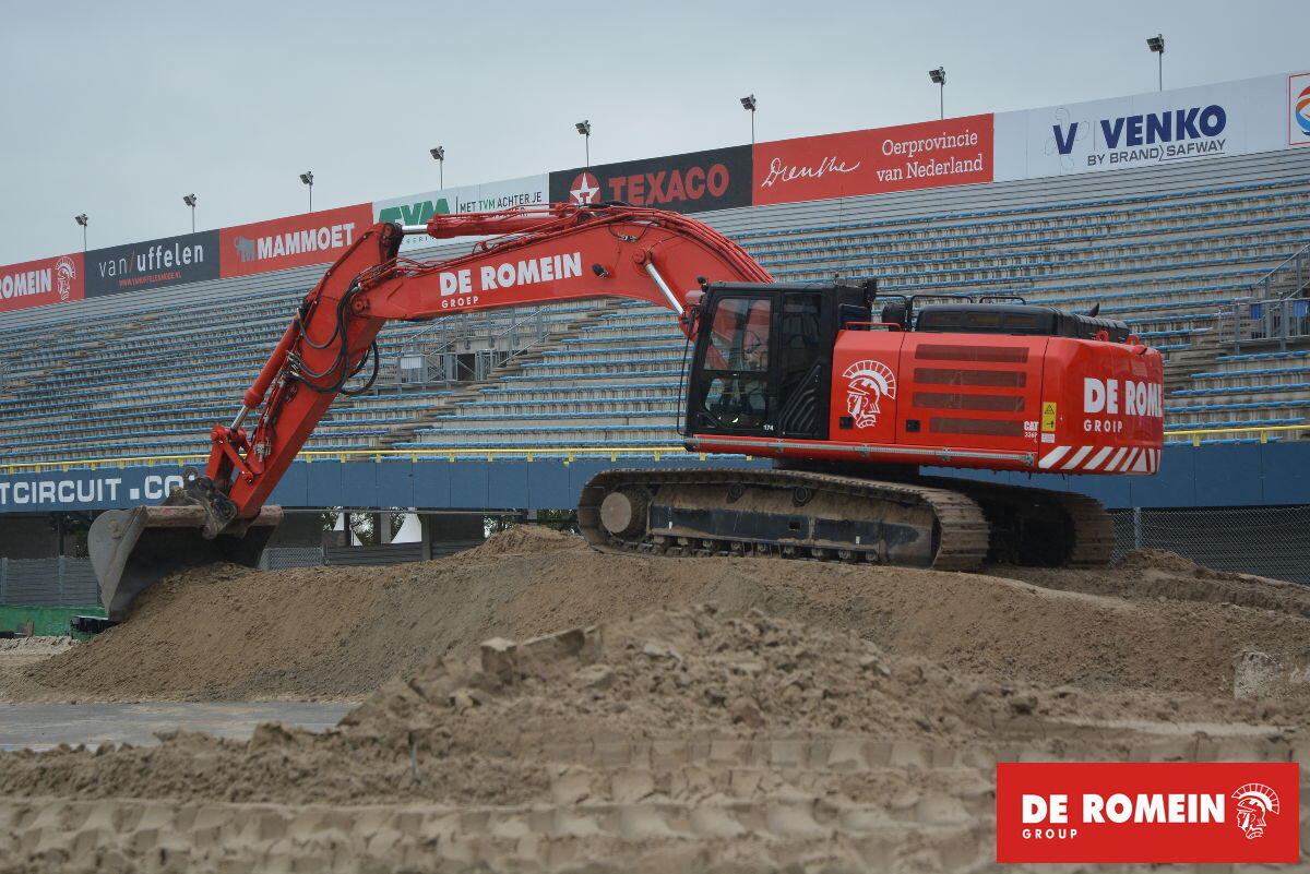 In the last week of September, we deployed all our resources to relocate the enormous quantity of 30,000 cubic meters of earth toward the main grandstand of the TT Circuit Assen, between Geert Timmerbocht and Haarbocht. That amounts to about a thousand truckloads of dirt. Using cranes, dump trucks, articulated dumpers, tractors, regular trucks, loaders, and bulldozers, we constructed the temporary motocross track to precisely meet the standards and requirements for a World Championship motocross track. And within three days after the race weekend, we had cleared all the sand from the motocross track as if nothing had ever happened.