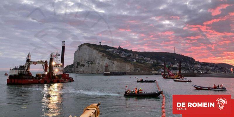 This project involves ballasting and finishing the power lines, restoring the quay, and the harbor channel. All of this will be carried out safely, neatly, and accurately in a very busy port. Our motivated employees will ensure that everything is restored to its original state and returned to the port authorities of Fécamp in a few months. In the near future, De Romein Nearshore LTD will undertake nearshore projects for the same client in both France and Germany, as well as the United Kingdom.