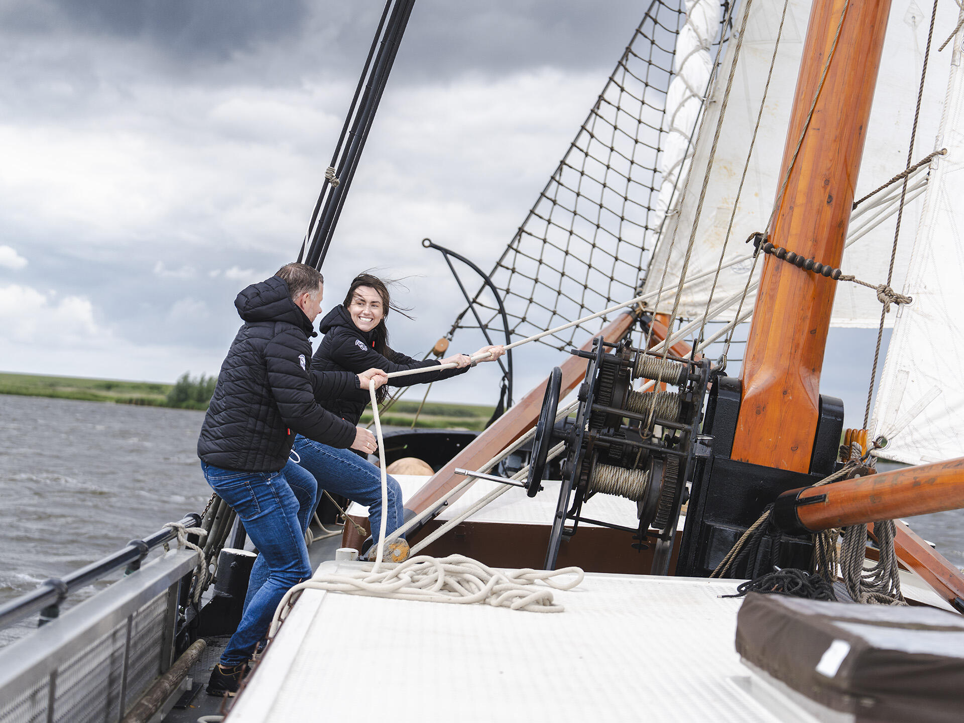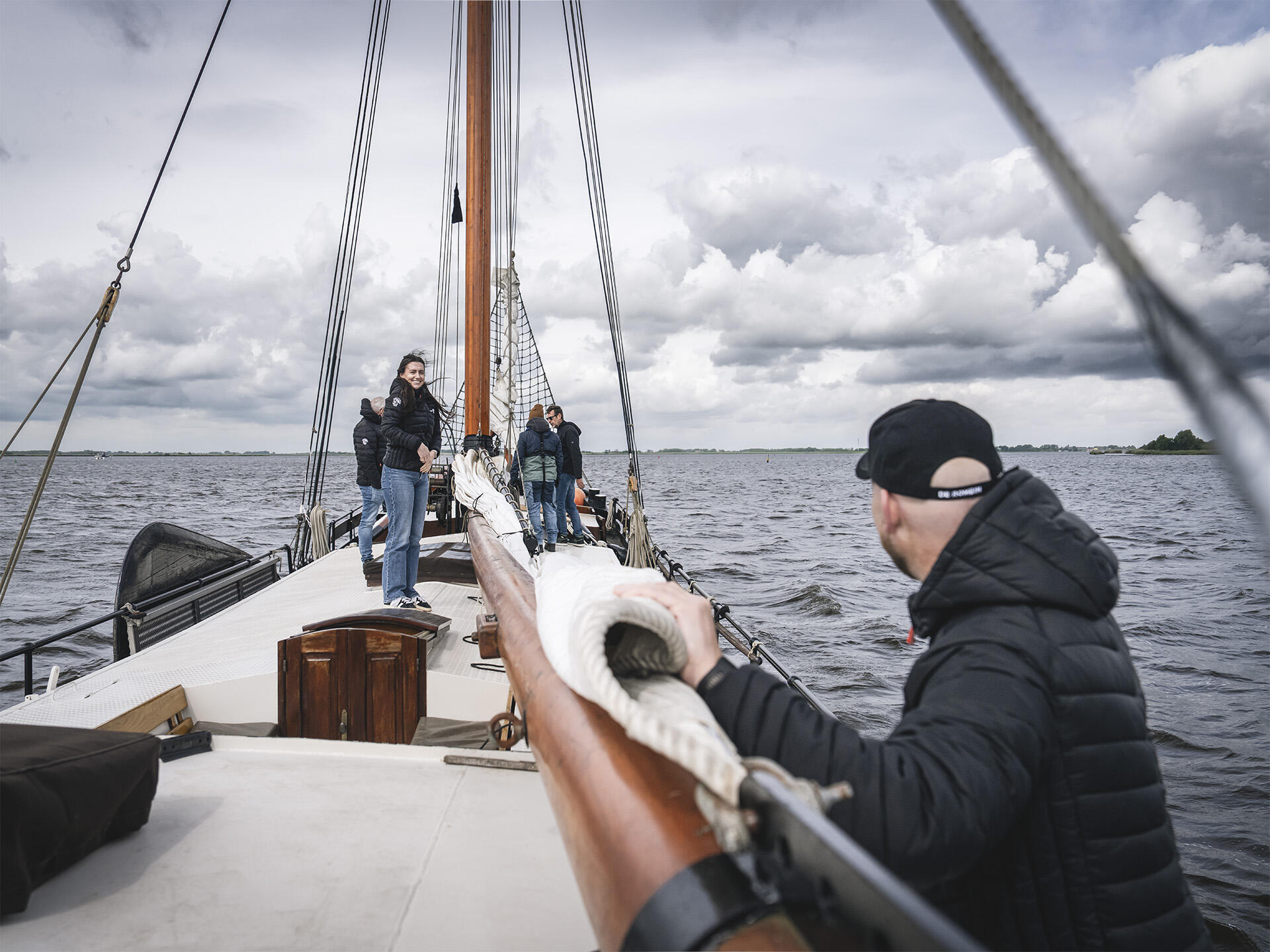 Among the imposing, red-colored equipment of De Romein's machinery, a sailboat immediately catches the eye. What at first glance may seem like an oddity, is in reality a valuable and unique addition. The Jonge Jan not only offers a special place for an inspiring and active (heath) day on the water, but is also the perfect setting for a relaxing boat trip with guests.