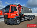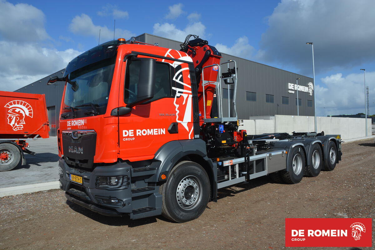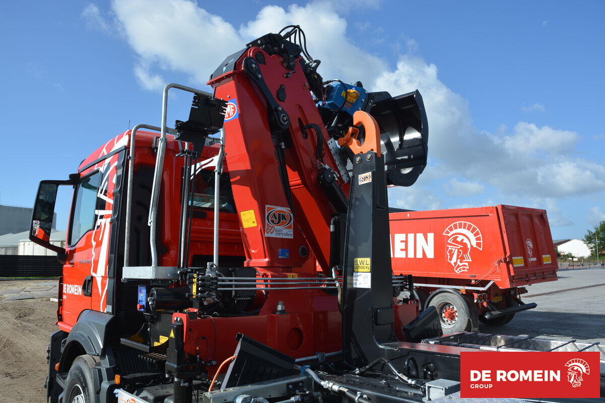 This powerful 470hp truck is equipped with a 22T/m HMF folding crane. In addition to the HMF crane, the vehicle is also fitted with a hook arm system for quickly loading and transporting containers. This multifunctional truck is being used on projects across Europe.
